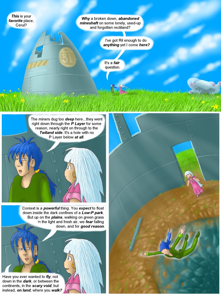 Earlier in the story, we have visited a Low-P park, where people enjoy what amounts to a zero-gravity experience, for fun, and for the play of sports. Such parks are carved from within the P-Layer, and as such are cave-like affairs, dank and sometimes moldering, lit only by artificed light fixtures. The air tends to be stale, and while a safe environment to float within, in that a person will not drift away and be lost, the experience is less like flying and more like being stuck in a rock-lined terrestrial space platform.