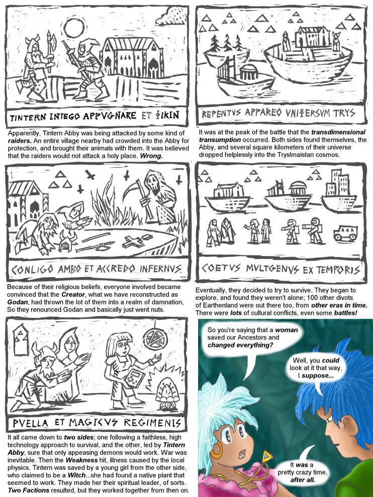 PAGE FOOTNOTES: The locations shown in the ancient Myrmidonian Tintern woodblocks are Tintern Abby, in Monmouthshire, South Wales, 1453, The Palace of Fine Arts and one small section of the San Francisco Bridge, San Francisco California, USA, 1989, and the 24th century high tech capital of the world, The Melbourne Quantum Technologies Park, Melbourne, Victoria, Australia, 2352.