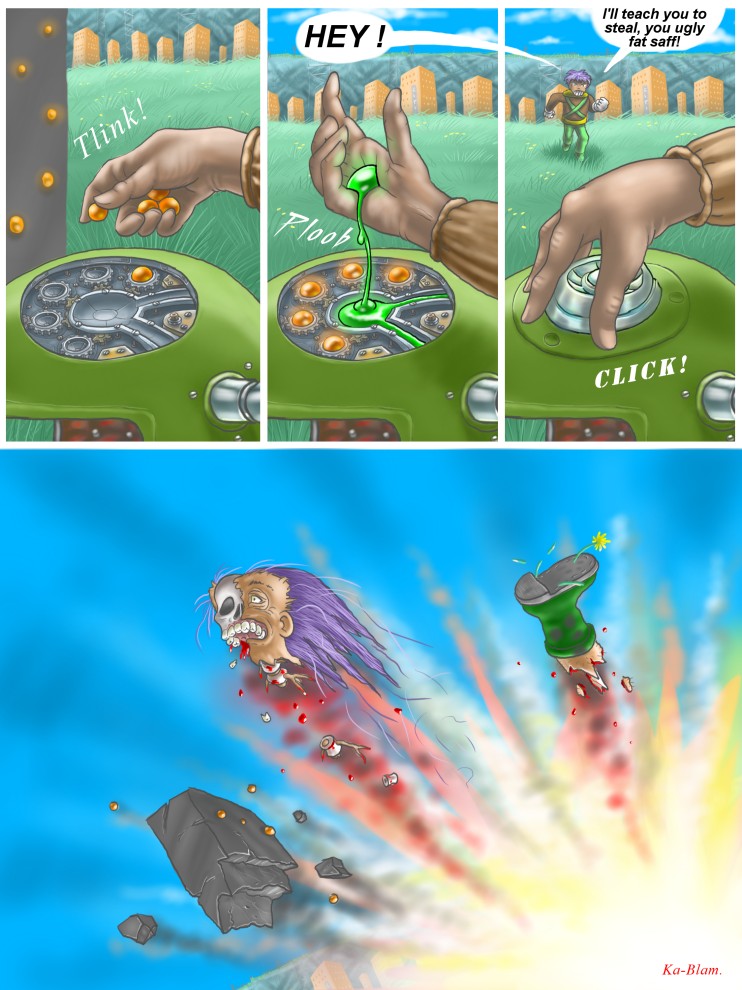 Hey, didn't he blow up real good? I thought so. You can avoid being horribly killed by angry outcasts simply by not insulting them. This has been a pubic service message by the National Emergency Redress Department. Drink your milk. And don't walk on my nice clean floors.