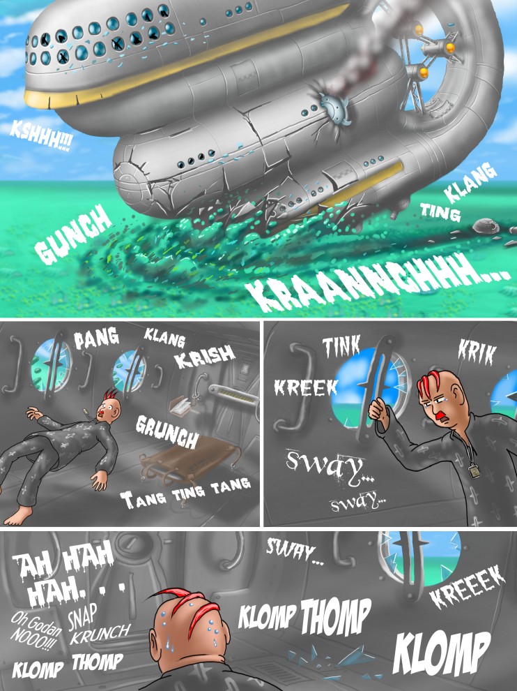 PAGE FOOTNOTES: Gunships are not made to be capable of landfall outside of a docking cradle, such as those at the port in Senryoku continent. Basically, Gunship Gold Six is toast here, and it is unlikely that it will remain tall and upright in the furrow it has created for long, especially with the constant wind of Pastellian space blowing. We can imagine the thin, tall, broken bulk of it swaying and creaking, just before a terrible, crushing topple.