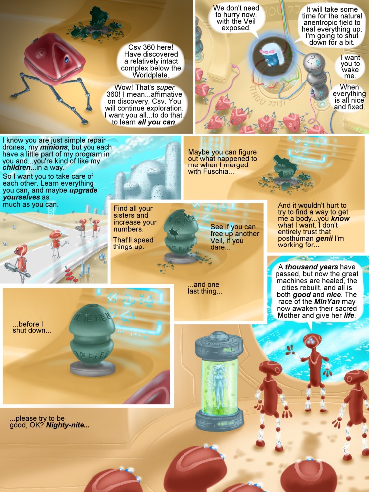 PAGE FOOTNOTES  It's surprisingly tough to choose a good name for a page, sometimes. I went through 'Mother's Day', briefly considered 'All My Children', passed on 'Darwin In Steel', although I thought it was pretty good... and even considered pretentious titles like 'Mechanus Darwinia'. Ecch. Finally it hit me that the speech of the head of the High Counsil of the MinYan sounded rather Lovecraftian. The stars were in their place and it was now time to resurrect the Elder God(dess). That's when I settled on The Call of Cthursor. You can't go too far wrong with a Lovecraft reference. I heart Lovecraft.