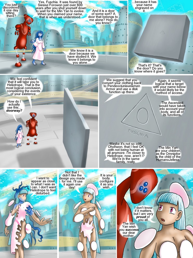 It should be understood that Fuschia/CURSOR's new body is not in any way what we would consider human, or even organic. It is alive, just in a very machine sort of way. Fuschia's new body is neither a robot nor a kind of meat; it is a kind of mesomechanical artificial life form, self-repairing, capable of a surprising amount of reconfiguration, capable of being adaptively powered by almost any kind of energy source, and holographically integral; which is to say that if even a small amount of it remains, it can regenerate the whole, intact and complete.