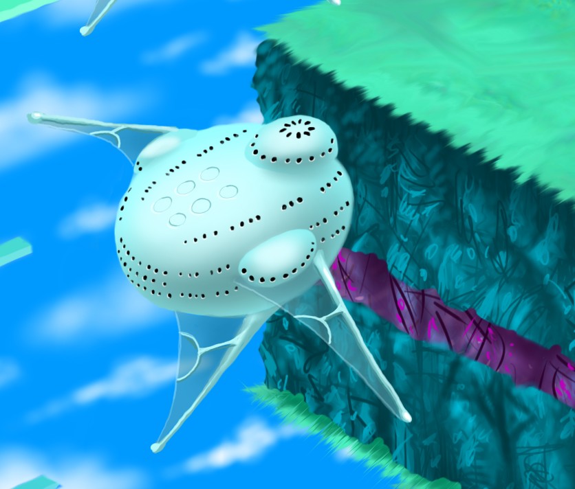 Pastellian Umor (Jellese) airship. These craft are manufactured by the constant partner species to the Jellese, the Slimes, using the same capacity that produces native Jellese buildings in the Universe of Tryslmaistan.