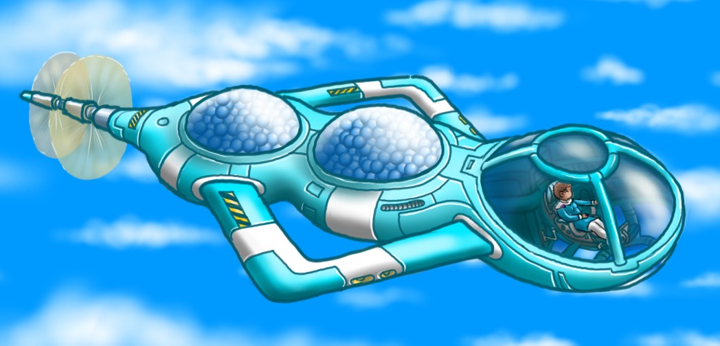 Hannya Nakimono's classic old DuoPod Rotorcar. It's a single-seat sport Aero that her father, Meiun, bought for her when she turned 19. He had it painted her favorite color, and generally rebuilt to perfect working order. The DuoPod uses twin, counter-rotating blades for primary propulsion and was quite the thing to have forty years in the past. Essentially, it is the earthly equivalent of having a classic sportscar. The DuoPods once were used for racing.