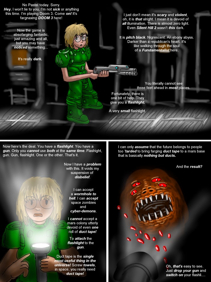 OMAKE FOOTNOTES: Doom 3 really is utterly fantastic. It's a bit like the original doom mixed with the dark world of Silent Hill 2, hence the reference. And, having to switch between gun and light does add to the tension, sure. But the monsters are so cool that it is kind of sad that you cannot always see what you are shooting. It's actually fairly easy to survive, if you are patient and sweep the chambers by the numbers. Nerve wracking and full of suspense, but not so difficult. Doom 3 is a suspense game, not a run-and-gun game. Keep that in mind, if you intend to get it.