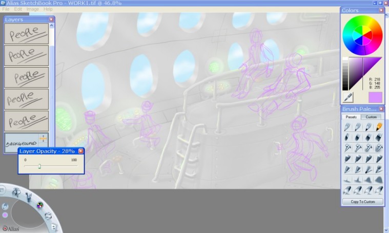 After the seats (and their shadows) are painted in, I use the layer control to fade out the background to a whisper of its former intensity, so that I can concentrate on drawing people without being confused by all the dark and light shapes. I do not fade the background out completely, of course, because I need to see how to place the flight crew into the scene, and where structures like hand rails might cover parts of them.