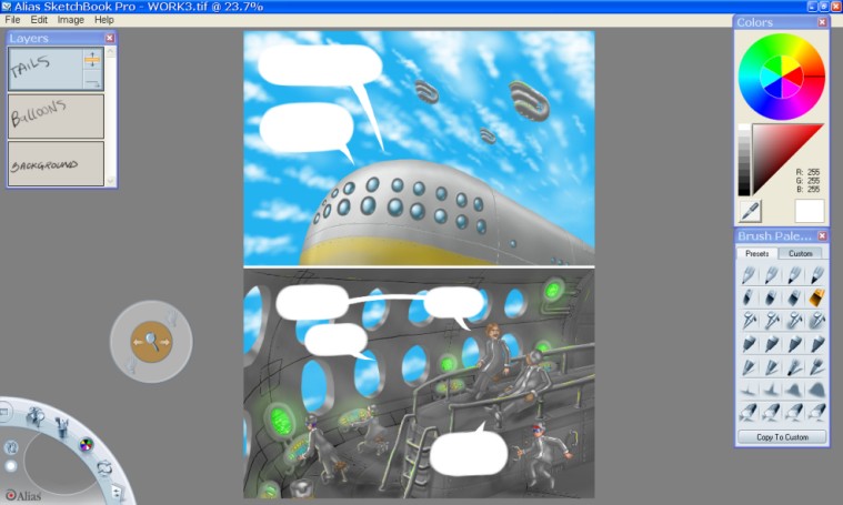 Word balloons, and the tails that extend from them are added next. I I do this in Alias Sketchpad Pro, because it has a much finer control over the work, I find, than I feel I have in Paintshop Pro 7.